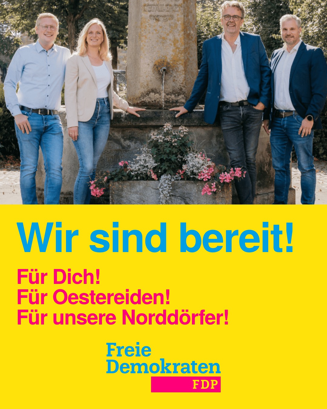 Wir sind bereit! Wir als FDP Oestereiden möchten uns vorstellen und ein klares Zeichen setzen: Wir hören zu, wir packen an und wir nehmen die Sorgen und Anliegen der Menschen in unserem Dorf ernst. Unser Ziel ist es, konkrete Projekte vor Ort umzusetzen, die bürgernah sind und nicht in politischen Theoriedebatten versanden. Wir wollen Dinge bewegen und das gemeinsam mit euch! Wofür wir stehen: 💯 Für ein lebenswertes, attraktives und modernes Oestereiden 💯 Für eine Politik mit gesundem Menschenverstand, Offenheit und Dialog 💯 Für ein Dorf, das seine Zukunft aktiv gestaltet! Mit starken Vereinen, guter Infrastruktur und echter Bürgerbeteiligung Wir sind hochmotiviert und voller Energie, um Ideen Wirklichkeit werden zu lassen. Der Kern unserer Gründung war es, unseren Ort nicht sich selbst zu überlassen, sondern aktiv daran mitzuwirken, dass Oestereiden für alle Generationen ein guter Ort zum Leben bleibt. Dabei leiten uns die liberalen und zukunftsorientierten Werte der Freien Demokraten: Eigenverantwortung, Freiheit, Fortschritt und Zusammenhalt. Wir freuen uns auf den Austausch mit euch und laden alle ein, mit uns gemeinsam Projekte anzustoßen, die unser Dorf voranbringen. 🟡 #WirFürOestereiden #FDP #Kommunalwahl2025 #WahlkampfStart #LiberalVorOrt #EinfachMachen #NeuerWind #TeamMitIdeen #FDPOestereiden #FDPRüthen #ChristofRasche #fdpkreissoest